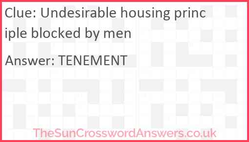 Undesirable housing principle blocked by men is a crossword clue for which we have 1 possible answer and we have spotted 1 times in our database. This crossword clue was last seen on 03 November 2024 in The Sun Cryptic Crossword puzzle!