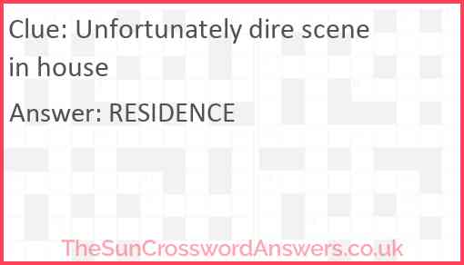 Unfortunately dire scene in house is a crossword clue for which we have 1 possible answer and we have spotted 1 times in our database. This crossword clue was last seen on 13 September 2020 in The Sun Cryptic Crossword puzzle!