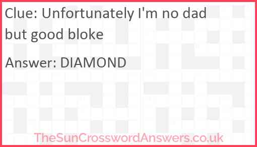 Unfortunately I'm no dad but good bloke is a crossword clue for which we have 1 possible answer and we have spotted 1 times in our database. This crossword clue was last seen on 02 September 2021 in The Sun Cryptic Crossword puzzle!