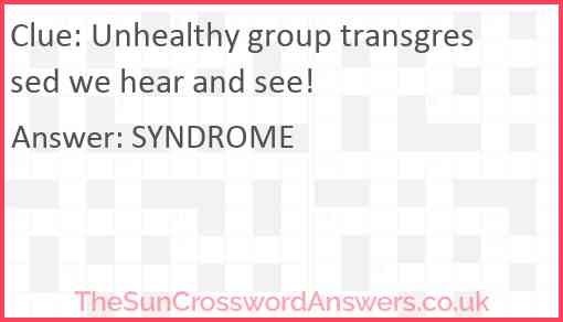 Unhealthy group transgressed we hear and see! is a crossword clue for which we have 1 possible answer and we have spotted 1 times in our database. This crossword clue was last seen on 01 September 2024 in The Sun Cryptic Crossword puzzle!