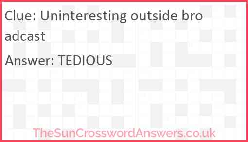 Uninteresting outside broadcast is a crossword clue for which we have 1 possible answer and we have spotted 2 times in our database. This crossword clue was last seen on 16 December 2024 in The Sun Cryptic Crossword puzzle!