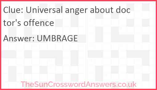 Universal anger about doctor's offence is a crossword clue for which we have 1 possible answer and we have spotted 3 times in our database. This crossword clue was last seen on 31 July 2023 in The Sun Cryptic Crossword puzzle!