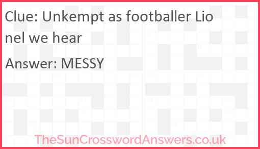 Unkempt as footballer Lionel we hear is a crossword clue for which we have 1 possible answer and we have spotted 2 times in our database. This crossword clue was last seen on 10 October 2023 in The Sun Cryptic Crossword puzzle!