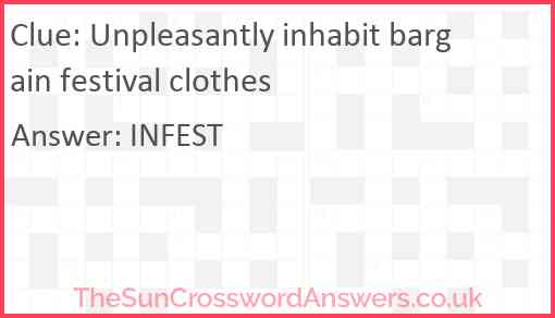 Unpleasantly inhabit bargain festival clothes is a crossword clue for which we have 1 possible answer and we have spotted 1 times in our database. This crossword clue was last seen on 27 February 2025 in The Sun Cryptic Crossword puzzle!