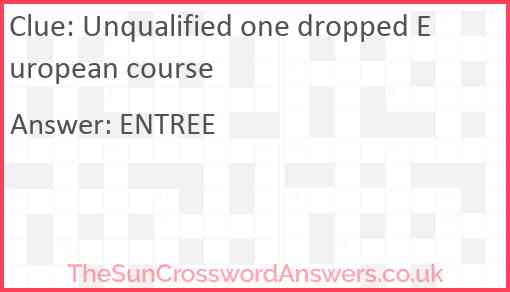 Unqualified one dropped European course is a crossword clue for which we have 1 possible answer and we have spotted 2 times in our database. This crossword clue was last seen on 05 January 2025 in The Sun Cryptic Crossword puzzle!