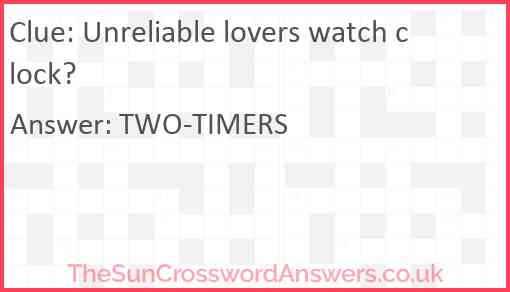 Unreliable lovers watch clock? is a crossword clue for which we have 2 possible answer and we have spotted 2 times in our database. This crossword clue was last seen on 04 January 2024 in The Sun Cryptic Crossword puzzle!