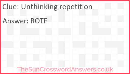 Unthinking repetition is a crossword clue for which we have 1 possible answer and we have spotted 1 times in our database. This crossword clue was last seen on 14 April 2019 in The Sun Coffee Time Crossword puzzle!