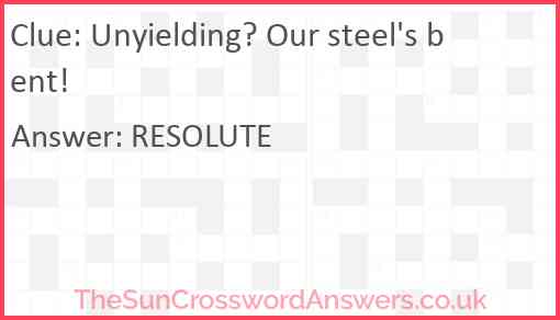 Unyielding? Our steel's bent! is a crossword clue for which we have 1 possible answer and we have spotted 1 times in our database. This crossword clue was last seen on 30 August 2023 in The Sun Cryptic Crossword puzzle!
