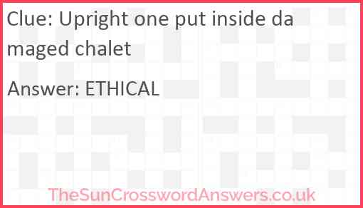 Upright one put inside damaged chalet is a crossword clue for which we have 1 possible answer and we have spotted 1 times in our database. This crossword clue was last seen on 20 October 2022 in The Sun Cryptic Crossword puzzle!