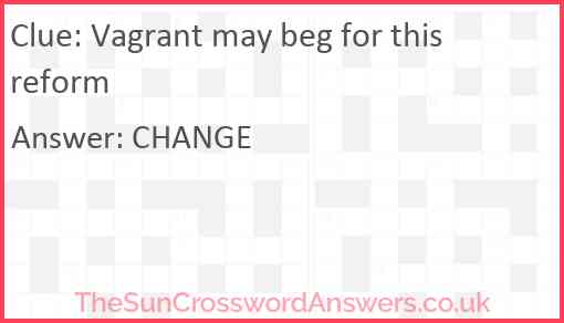 Vagrant may beg for this reform is a crossword clue for which we have 1 possible answer and we have spotted 1 times in our database. This crossword clue was last seen on 11 December 2020 in The Sun Cryptic Crossword puzzle!