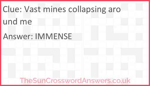 Vast mines collapsing around me is a crossword clue for which we have 1 possible answer and we have spotted 3 times in our database. This crossword clue was last seen on 15 February 2024 in The Sun Cryptic Crossword puzzle!