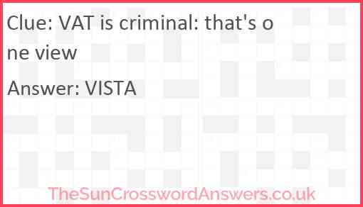 VAT is criminal: that's one view is a crossword clue for which we have 1 possible answer and we have spotted 1 times in our database. This crossword clue was last seen on 23 April 2021 in The Sun Cryptic Crossword puzzle!
