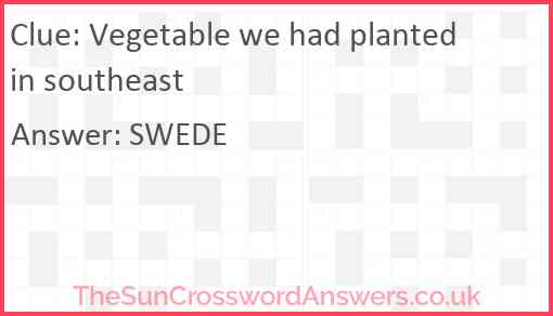 Vegetable we had planted in southeast is a crossword clue for which we have 1 possible answer and we have spotted 2 times in our database. This crossword clue was last seen on 31 July 2024 in The Sun Cryptic Crossword puzzle!