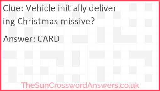 Vehicle initially delivering Christmas missive? is a crossword clue for which we have 1 possible answer and we have spotted 2 times in our database. This crossword clue was last seen on 31 December 2023 in The Sun Cryptic Crossword puzzle!