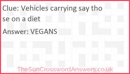 Vehicles carrying say those on a diet is a crossword clue for which we have 1 possible answer and we have spotted 1 times in our database. This crossword clue was last seen on 12 September 2023 in The Sun Cryptic Crossword puzzle!