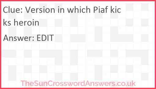 Version in which Piaf kicks heroin is a crossword clue for which we have 1 possible answer and we have spotted 1 times in our database. This crossword clue was last seen on 19 March 2025 in The Sun Cryptic Crossword puzzle!