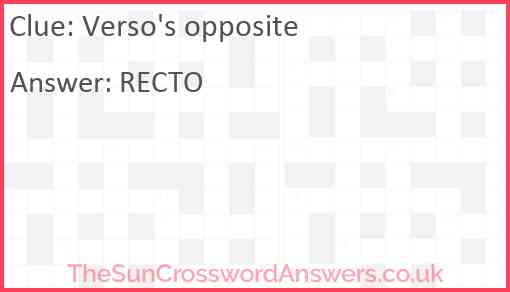 Verso's opposite is a crossword clue for which we have 1 possible answer and we have spotted 2 times in our database. This crossword clue was last seen on 05 November 2024 in The Sun Coffee Time Crossword puzzle!