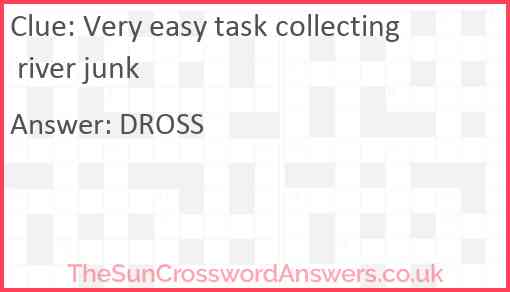 Very easy task collecting river junk is a crossword clue for which we have 1 possible answer and we have spotted 2 times in our database. This crossword clue was last seen on 19 September 2024 in The Sun Cryptic Crossword puzzle!