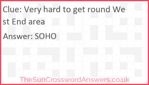 Very hard to get round West End area is a crossword clue for which we have 1 possible answer and we have spotted 1 times in our database. This crossword clue was last seen on 22 February 2025 in The Sun Cryptic Crossword puzzle!