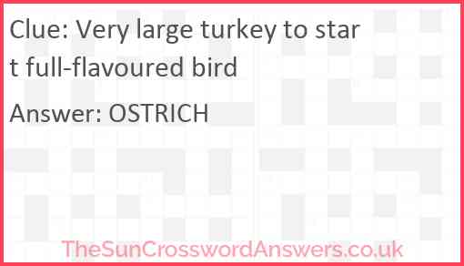 Very large turkey to start full-flavoured bird is a crossword clue for which we have 1 possible answer and we have spotted 1 times in our database. This crossword clue was last seen on 14 February 2022 in The Sun Cryptic Crossword puzzle!