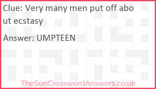 Very many men put off about ecstasy is a crossword clue for which we have 1 possible answer and we have spotted 2 times in our database. This crossword clue was last seen on 11 November 2022 in The Sun Cryptic Crossword puzzle!