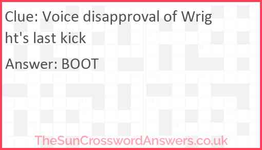 Voice disapproval of Wright's last kick is a crossword clue for which we have 1 possible answer and we have spotted 1 times in our database. This crossword clue was last seen on 21 May 2024 in The Sun Cryptic Crossword puzzle!