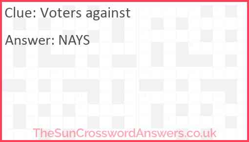 Voters against is a crossword clue for which we have 1 possible answer and we have spotted 1 times in our database. This crossword clue was last seen on 01 February 2025 in The Sun Coffee Time Crossword puzzle!