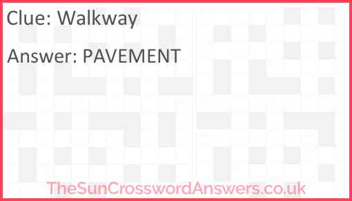 Walkway is a crossword clue for which we have 1 possible answer and we have spotted 8 times in our database. This crossword clue was last seen on 10 April 2024 in The Sun Coffee Time Crossword puzzle!