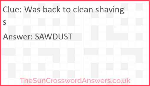 Was back to clean shavings is a crossword clue for which we have 1 possible answer and we have spotted 1 times in our database. This crossword clue was last seen on 25 February 2019 in The Sun Cryptic Crossword puzzle!