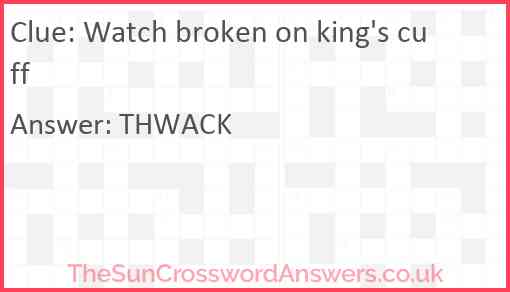 Watch broken on king's cuff is a crossword clue for which we have 1 possible answer and we have spotted 2 times in our database. This crossword clue was last seen on 16 January 2023 in The Sun Cryptic Crossword puzzle!