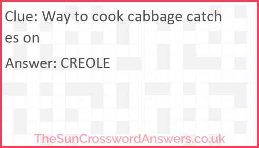 Way to cook cabbage catches on is a crossword clue for which we have 1 possible answer and we have spotted 3 times in our database. This crossword clue was last seen on 13 November 2024 in The Sun Cryptic Crossword puzzle!