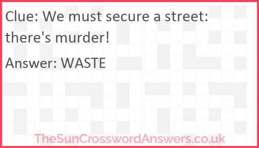 We must secure a street: there's murder! is a crossword clue for which we have 1 possible answer and we have spotted 1 times in our database. This crossword clue was last seen on 17 February 2025 in The Sun Cryptic Crossword puzzle!