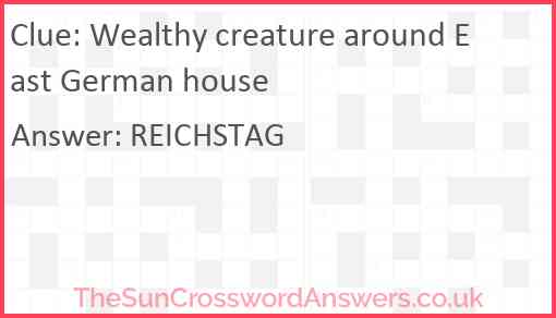 Wealthy creature around East German house is a crossword clue for which we have 1 possible answer and we have spotted 1 times in our database. This crossword clue was last seen on 13 December 2024 in The Sun Cryptic Crossword puzzle!
