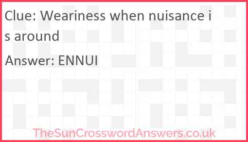 Weariness when nuisance is around is a crossword clue for which we have 1 possible answer and we have spotted 1 times in our database. This crossword clue was last seen on 02 April 2024 in The Sun Cryptic Crossword puzzle!