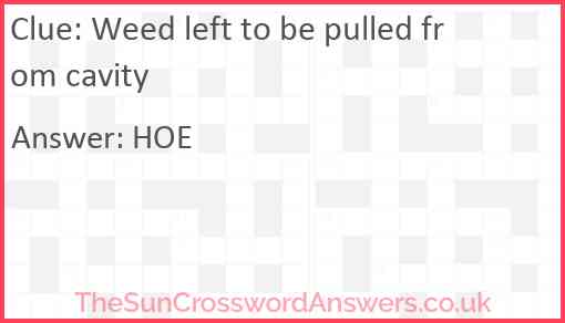 Weed left to be pulled from cavity is a crossword clue for which we have 1 possible answer and we have spotted 2 times in our database. This crossword clue was last seen on 12 December 2024 in The Sun Cryptic Crossword puzzle!