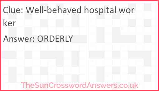 Well-behaved hospital worker is a crossword clue for which we have 1 possible answer and we have spotted 2 times in our database. This crossword clue was last seen on 27 February 2025 in The Sun Cryptic Crossword puzzle!