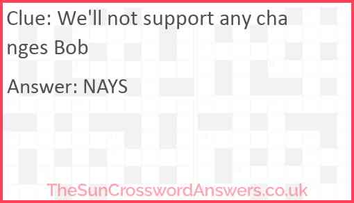 We'll not support any changes Bob is a crossword clue for which we have 1 possible answer and we have spotted 1 times in our database. This crossword clue was last seen on 01 February 2025 in The Sun Cryptic Crossword puzzle!