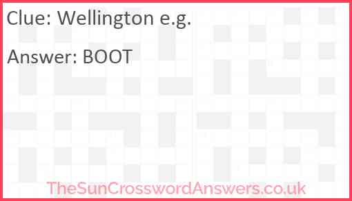 Wellington e.g. is a crossword clue for which we have 1 possible answer and we have spotted 3 times in our database. This crossword clue was last seen on 13 March 2022 in The Sun Coffee Time Crossword puzzle!