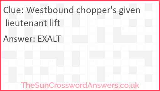 Westbound chopper's given lieutenant lift is a crossword clue for which we have 1 possible answer and we have spotted 1 times in our database. This crossword clue was last seen on 03 October 2024 in The Sun Cryptic Crossword puzzle!
