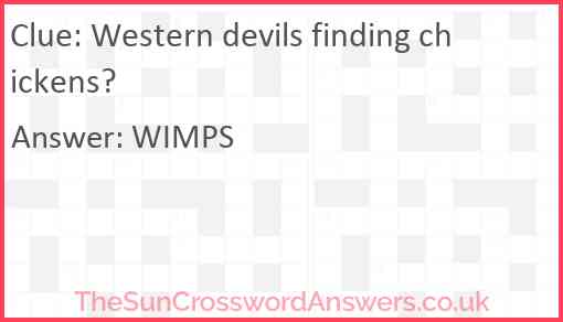 Western devils finding chickens? is a crossword clue for which we have 1 possible answer and we have spotted 2 times in our database. This crossword clue was last seen on 11 March 2023 in The Sun Cryptic Crossword puzzle!