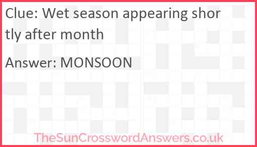Wet season appearing shortly after month is a crossword clue for which we have 1 possible answer and we have spotted 1 times in our database. This crossword clue was last seen on 17 December 2020 in The Sun Cryptic Crossword puzzle!