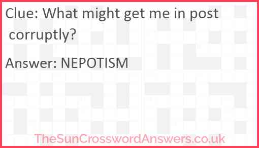 What might get me in post corruptly? is a crossword clue for which we have 1 possible answer and we have spotted 1 times in our database. This crossword clue was last seen on 08 September 2020 in The Sun Cryptic Crossword puzzle!