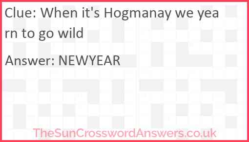 When it's Hogmanay we yearn to go wild is a crossword clue for which we have 1 possible answer and we have spotted 1 times in our database. This crossword clue was last seen on 03 May 2023 in The Sun Cryptic Crossword puzzle!