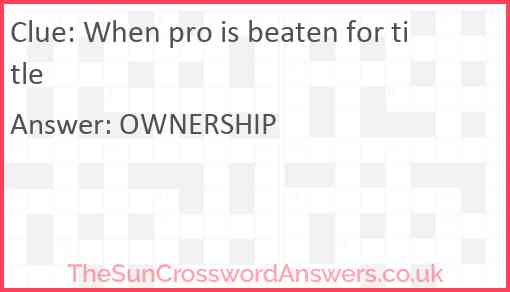 When pro is beaten for title is a crossword clue for which we have 1 possible answer and we have spotted 2 times in our database. This crossword clue was last seen on 30 October 2022 in The Sun Cryptic Crossword puzzle!