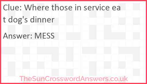 Where those in service eat dog's dinner is a crossword clue for which we have 1 possible answer and we have spotted 1 times in our database. This crossword clue was last seen on 29 September 2024 in The Sun Cryptic Crossword puzzle!