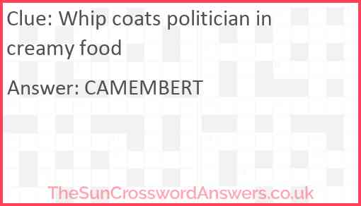 Whip coats politician in creamy food is a crossword clue for which we have 1 possible answer and we have spotted 1 times in our database. This crossword clue was last seen on 12 March 2022 in The Sun Cryptic Crossword puzzle!