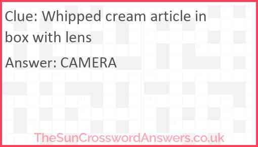 Whipped cream article in box with lens is a crossword clue for which we have 1 possible answer and we have spotted 2 times in our database. This crossword clue was last seen on 02 December 2023 in The Sun Cryptic Crossword puzzle!