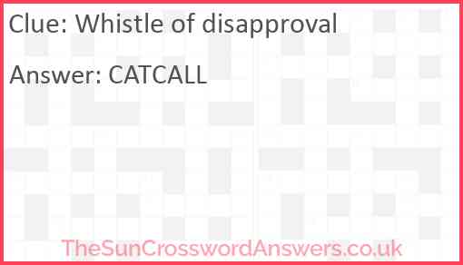 Whistle of disapproval is a crossword clue for which we have 1 possible answer and we have spotted 2 times in our database. This crossword clue was last seen on 21 December 2020 in The Sun Coffee Time Crossword puzzle!