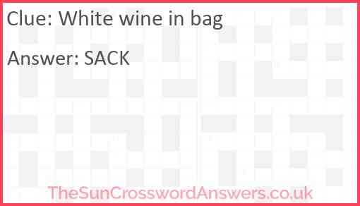 White wine in bag is a crossword clue for which we have 1 possible answer and we have spotted 1 times in our database. This crossword clue was last seen on 07 March 2021 in The Sun Cryptic Crossword puzzle!