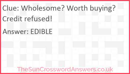 Wholesome? Worth buying? Credit refused! is a crossword clue for which we have 1 possible answer and we have spotted 2 times in our database. This crossword clue was last seen on 04 February 2025 in The Sun Cryptic Crossword puzzle!